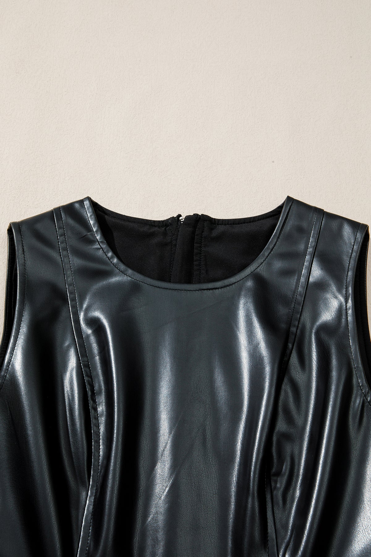 Rock an edgy-meets-feminine vibe in this sleek black faux leather mini dress. The ruffled hem adds a playful twist to the structured material, while the sleeveless cut keeps things modern and versatile—layer it over a tee or let it stand alone. Perfect for making a bold statement with effortless style.