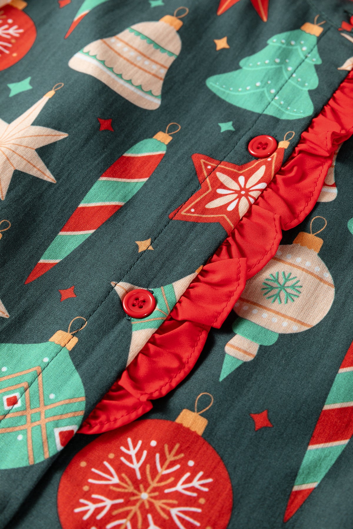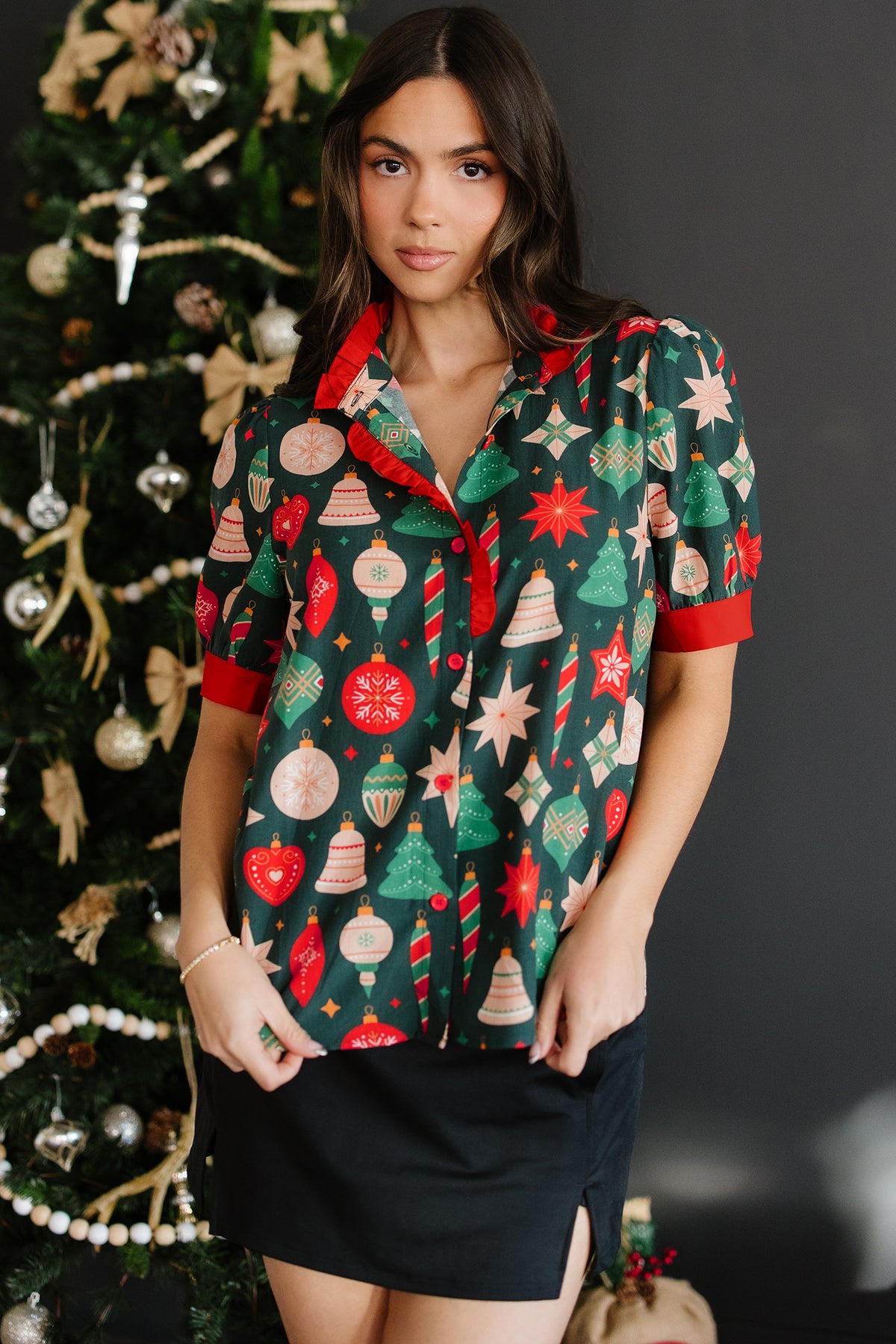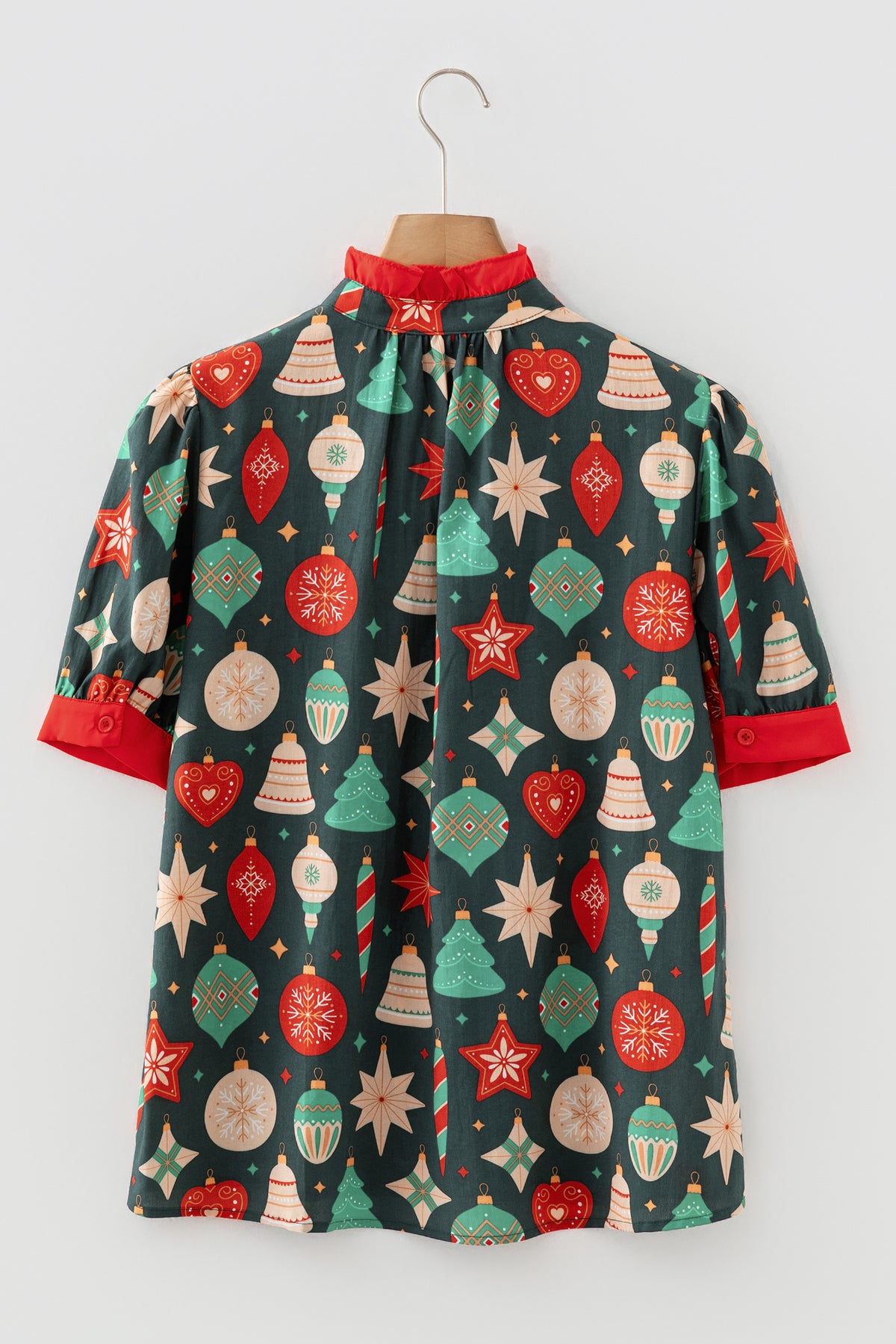 Spread holiday cheer in this festive Christmas print blouse that brings joy to your seasonal wardrobe. The charming frilled neckline and contrast trim details add a whimsical, feminine touch perfect for celebrations. Bubble sleeves with button accents deliver playful flair while keeping things polished and put-together. Made from soft, lightweight fabric, this blouse keeps you comfortable whether you're hosting gatherings or enjoying festive outings. It's the perfect piece to mix and match with your holiday looks.