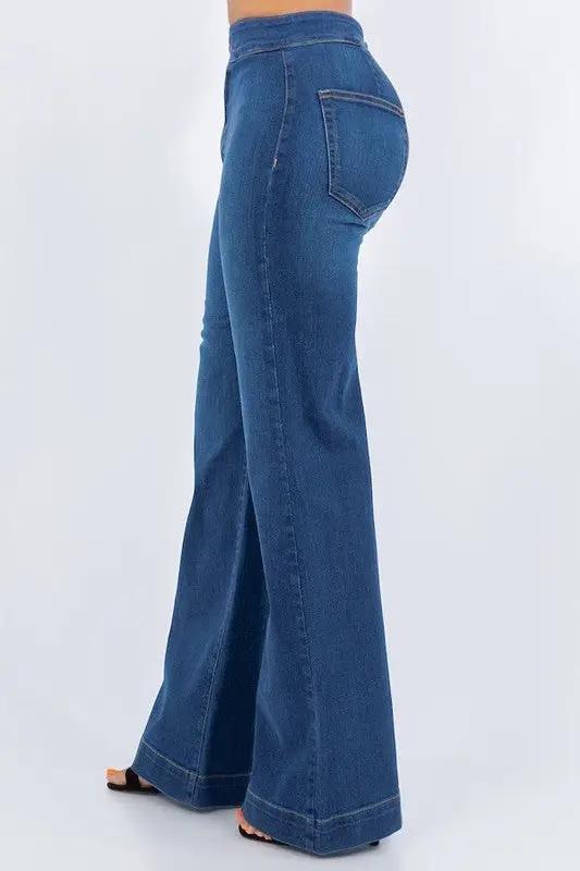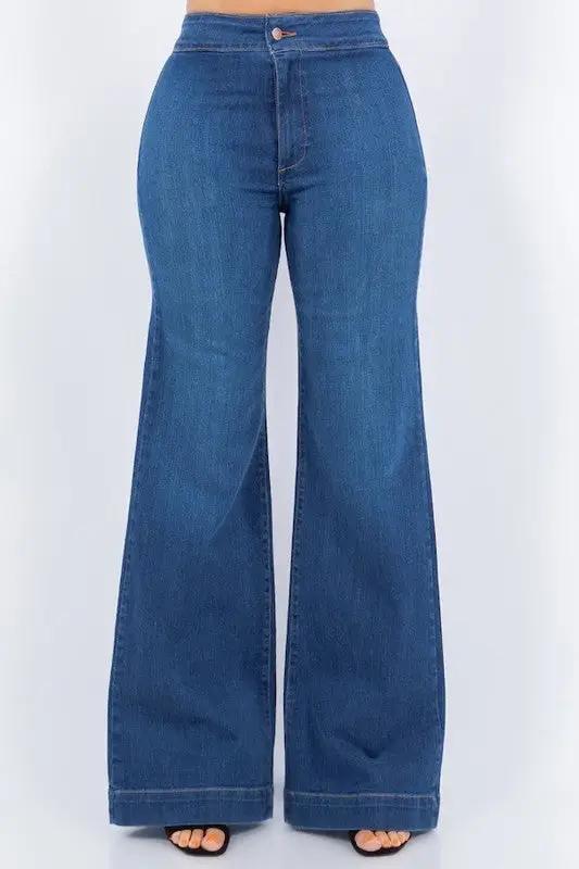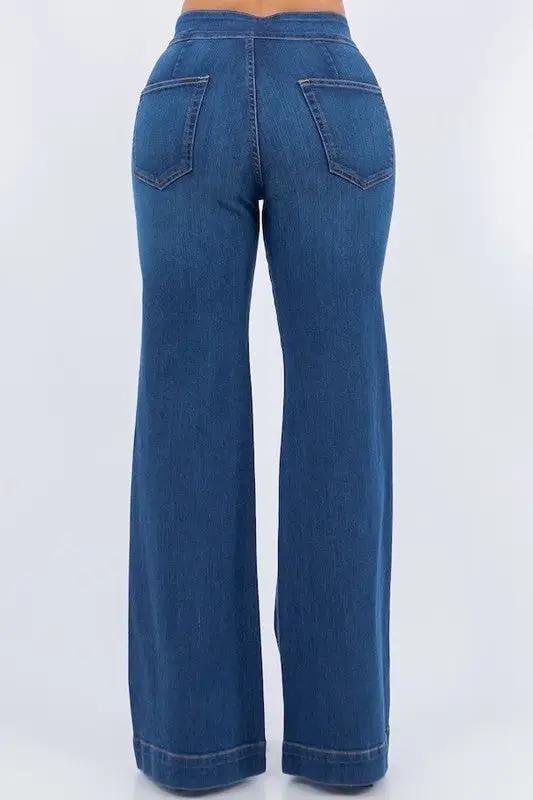 Get ready to meet your new favorite jeans: the Harley Wide Leg! Combining style and comfort like never before, these denims feature a stretchy premium fabric, a wide waistband, and a unique medium wash. With a front button and zipper closure, back pockets, and a wide hem detail, these jeans have it all. Best part? They're made right here in the USA and come in a perfect 32\" inseam. Say hello to your new go-to jeans!