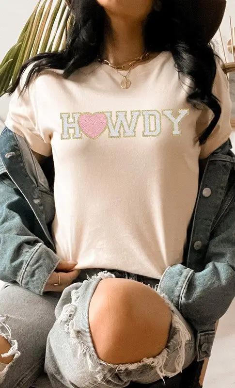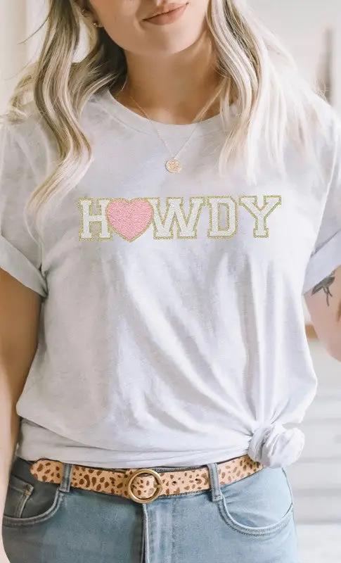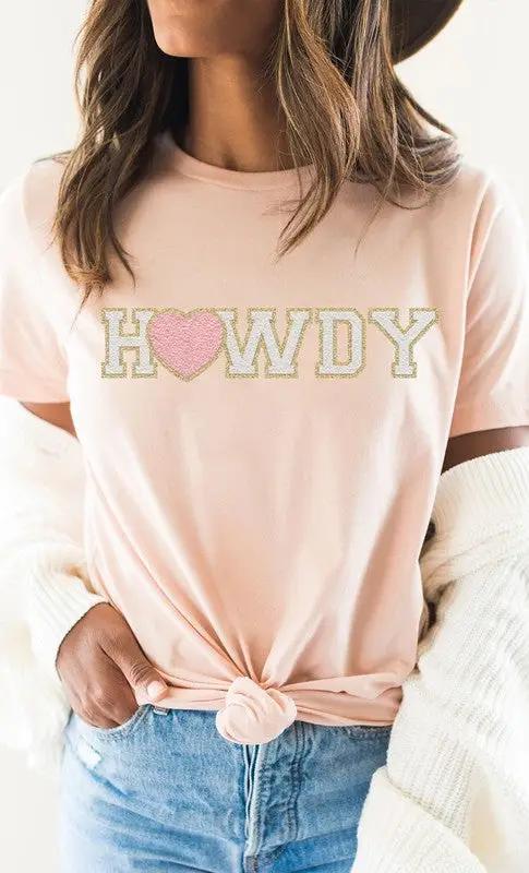 Heart Howdy Print Chenille Letters PLUS SIZE Graphic Tee. White, Cream and Citron tees are 100% cotton, Ash tees are 99/1 cotton/polyester blend. Peach is 52/48 cotton/poly blend.
