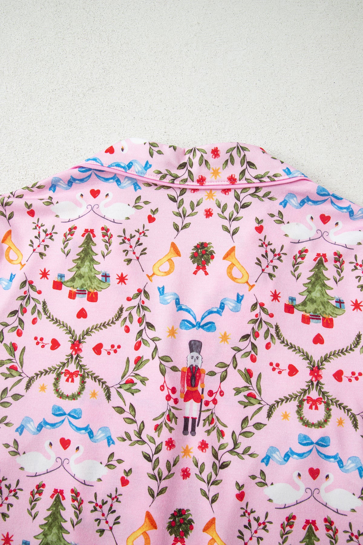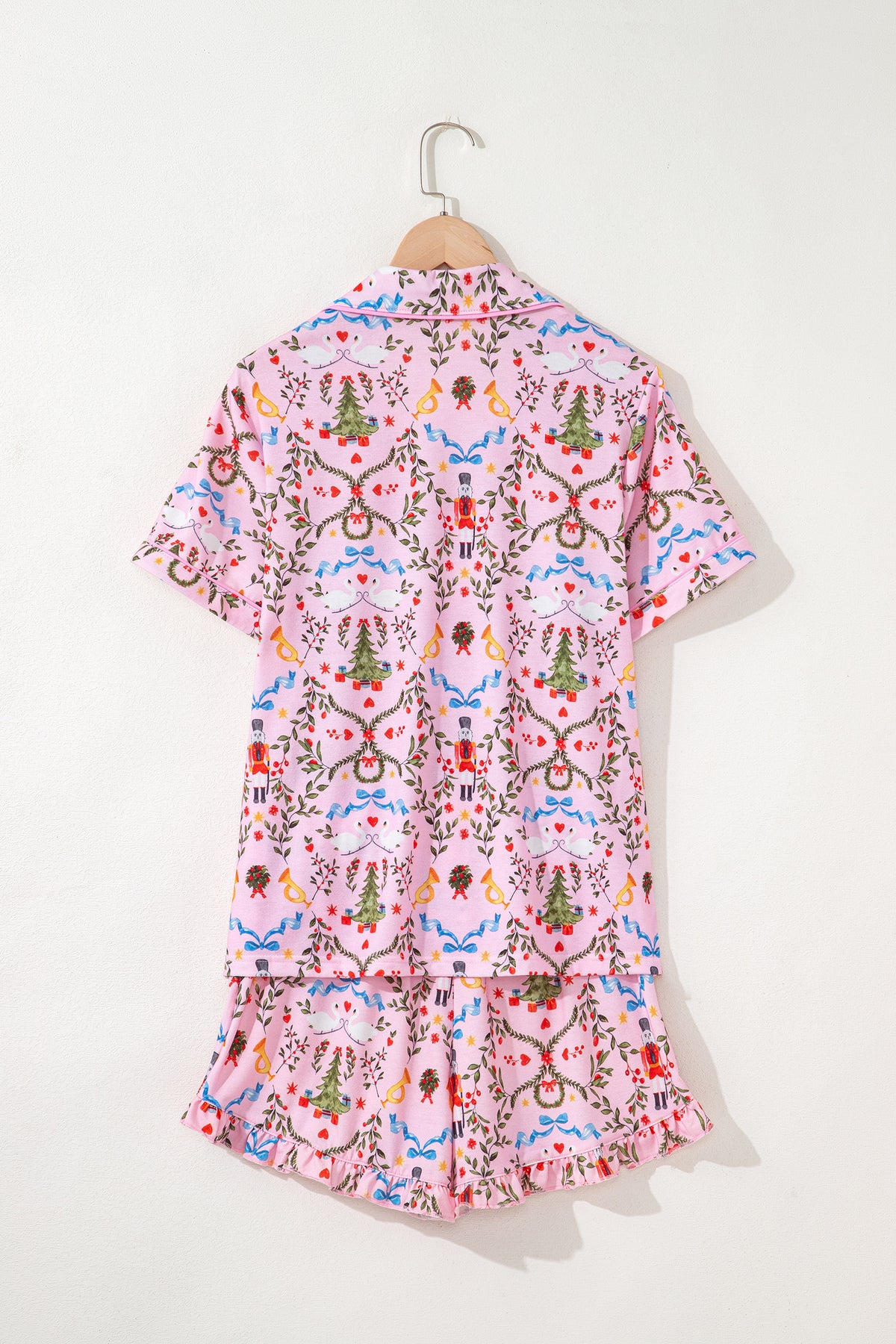 Get into the holiday spirit with our Pink Nutcracker Doll Christmas Print Ribbon Tie Waist Short 2pcs Pajama Set! This adorable two-piece features a festive nutcracker print that brings instant Christmas cheer to bedtime. The soft, breathable fabric keeps you cozy all night long, while the charming ribbon tie waist lets you customize the fit with a feminine touch. Complete with a short sleeve top and matching shorts, this set is your ticket to merry, comfortable nights throughout the season. Perfect for holiday lounging or gifting to someone special!