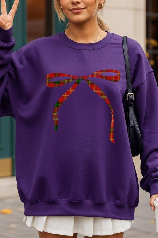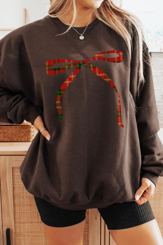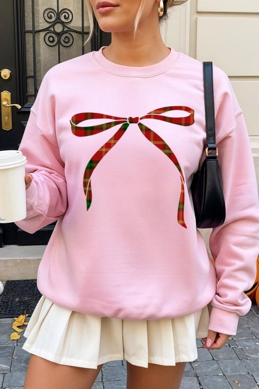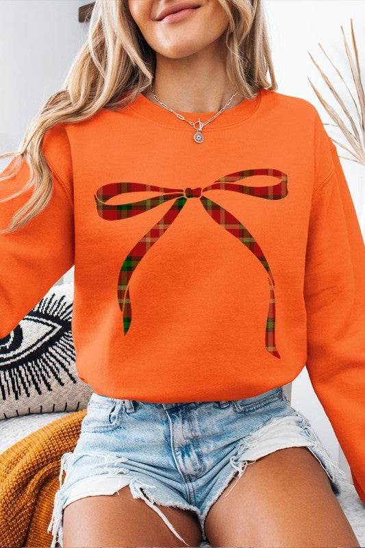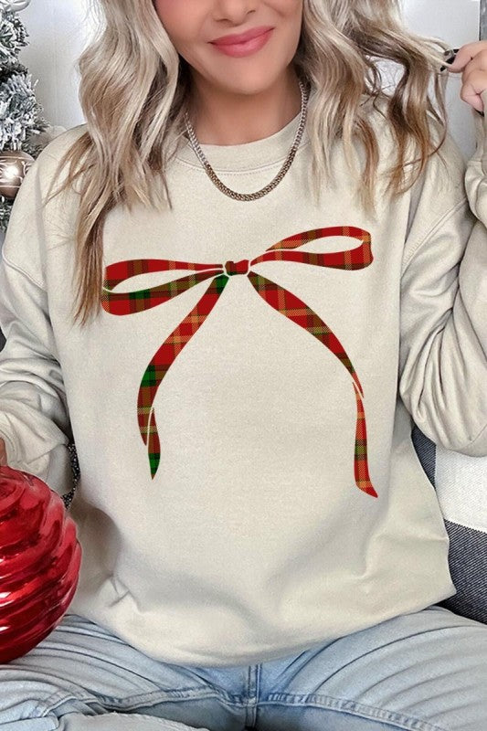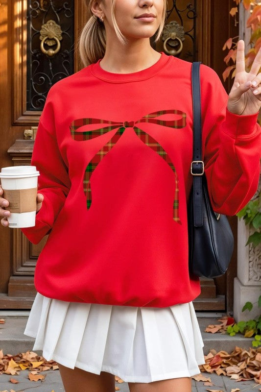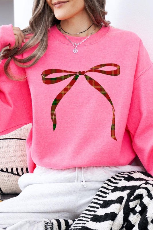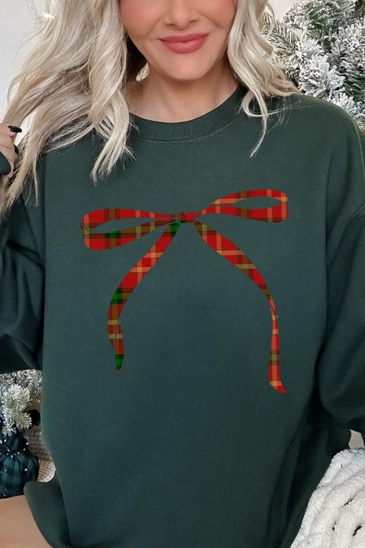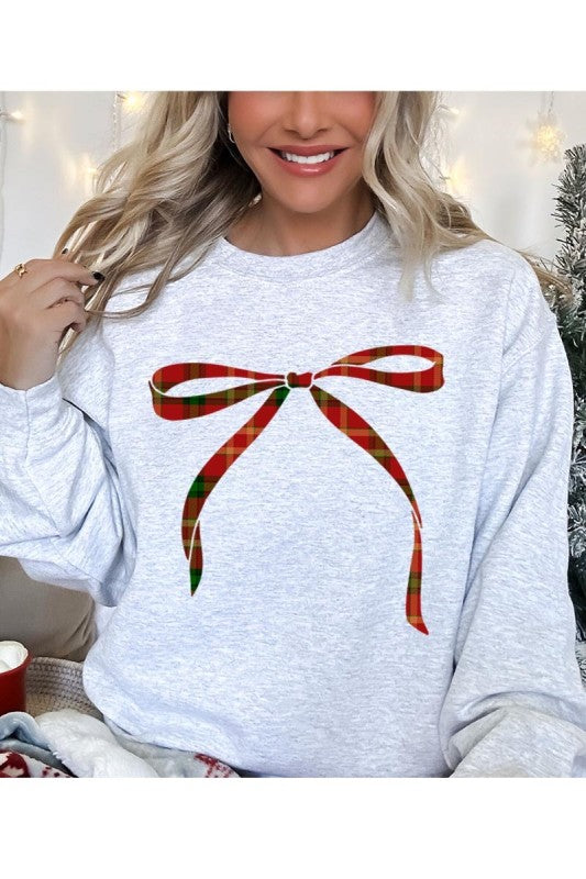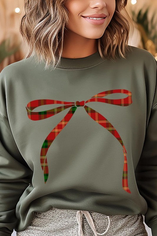 plaid Christmas bow shirt, holiday ribbon top, red plaid bow tee, festive outfit, merry bright tee, Christmas fashion top, gift bow shirt, cozy holiday Graphic Fleece Sweatshirt.