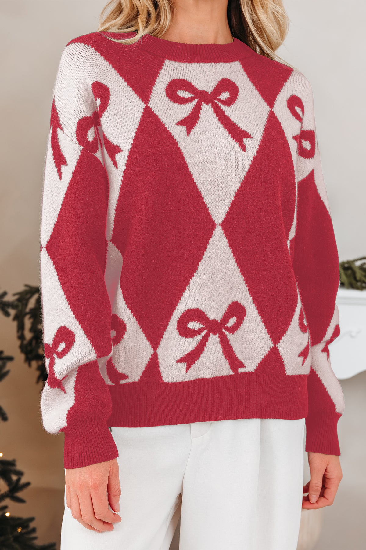 Red Bow Print 2-tone Rhombus Knit Loose Sweater