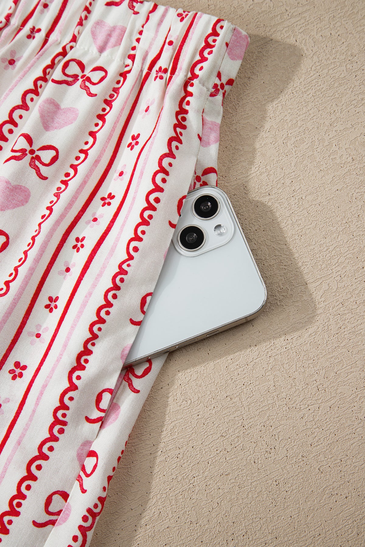 Red Cute Bow Heart Print Ribbon Decor Short 2pcs Pajama Set