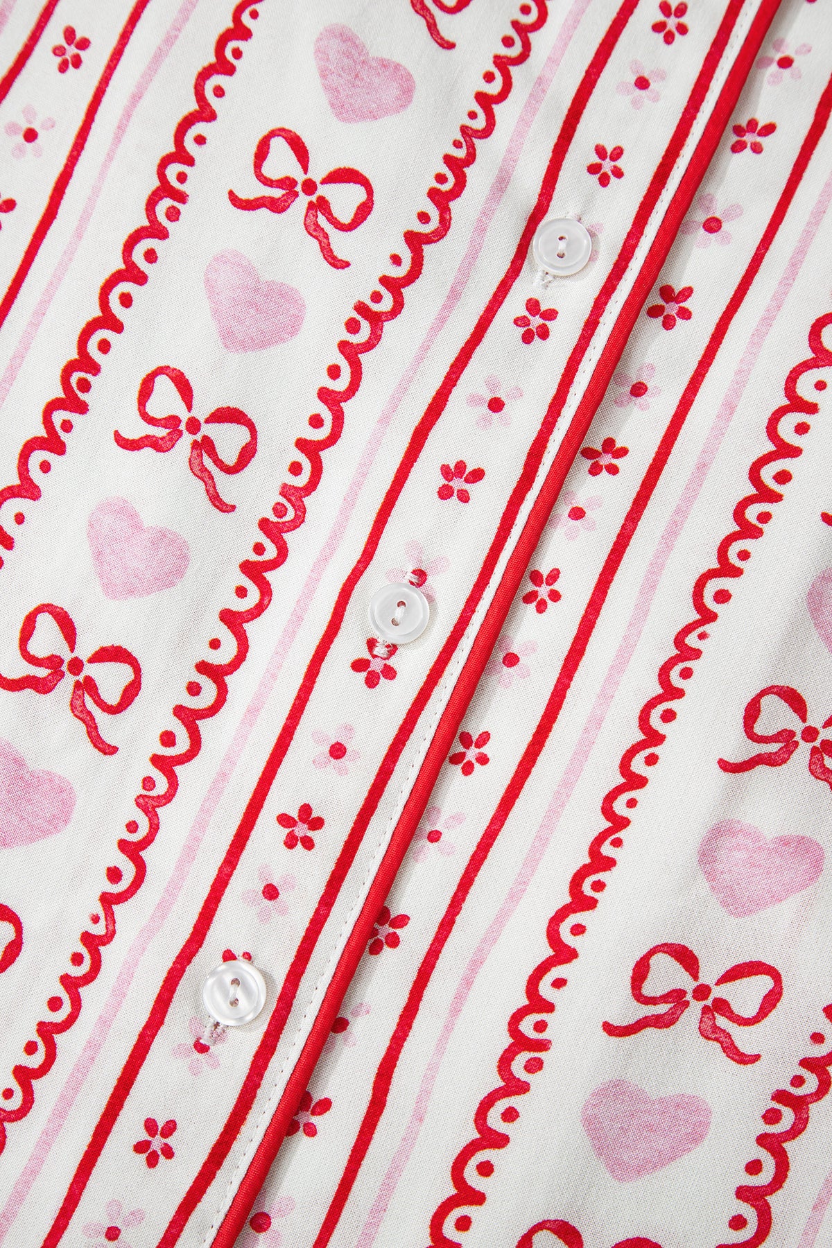 Get ready to celebrate love in the coziest way possible with this adorable Valentine's Day pajama set. Featuring a sweet bow and heart print adorned with charming ribbon details, this two-piece set is pure romance wrapped in comfort. The shirt-style top pairs perfectly with matching shorts, creating an effortless loungewear look that's as cute as it is practical. Crafted from quality fabric with a relaxed silhouette, you'll want to live in these all season long. Pre-order now and make your Valentine's nights extra special.