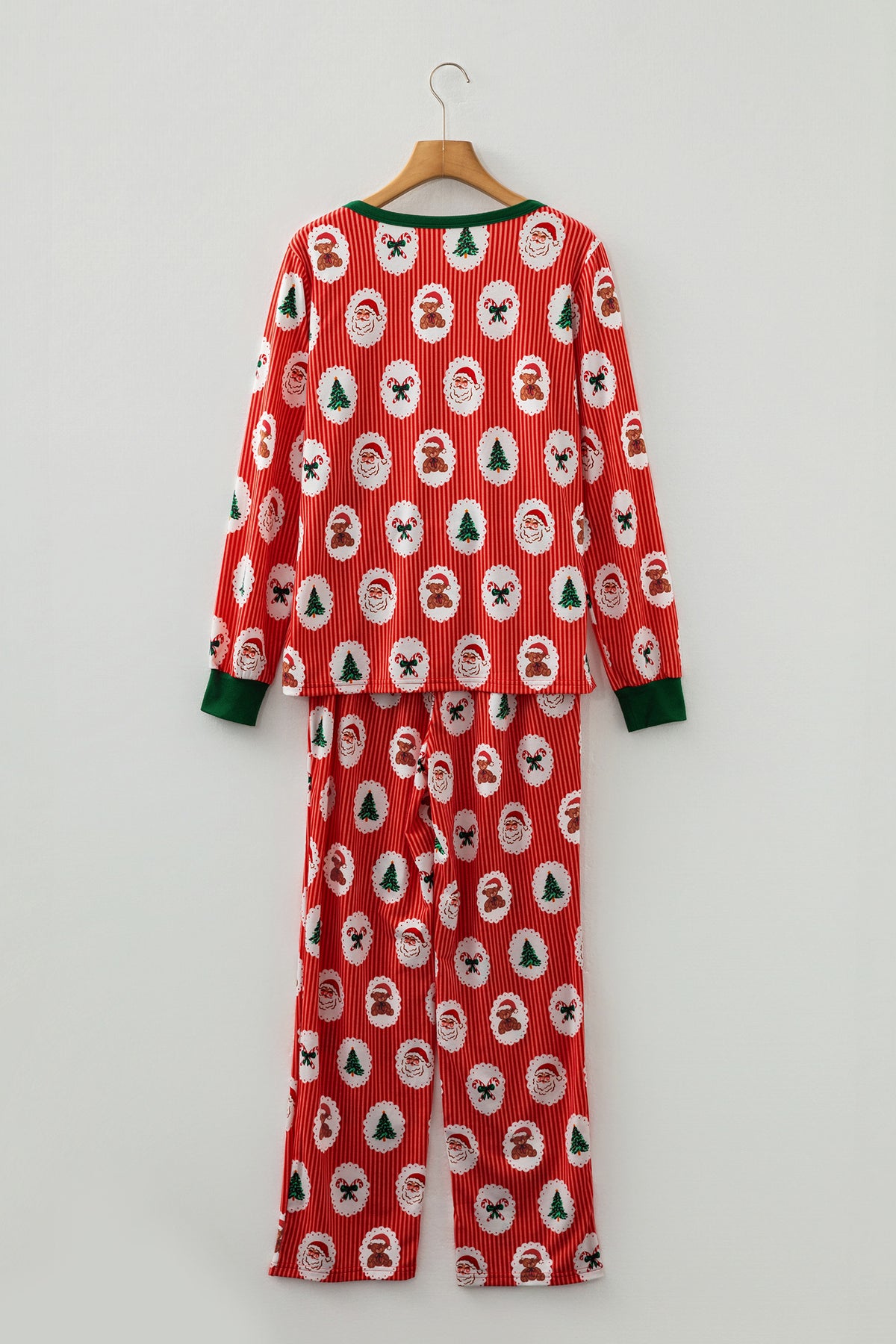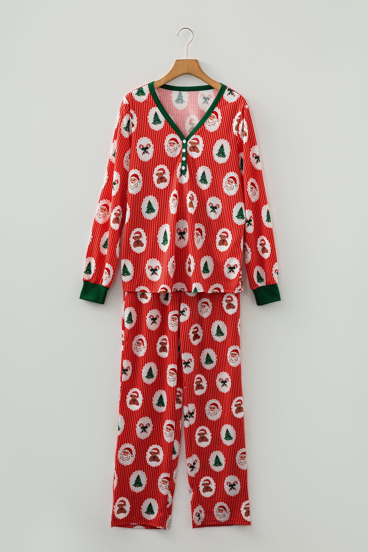 Celebrate the season in style with this festive two-piece lounge set that's ready for holiday fun! The Henley V-neck pullover showcases a cheerful Christmas fashion print with classic red stripes, giving you that perfect blend of seasonal cheer and casual cool. The matching jogger pants feature an adjustable drawstring and cuffed ankles for a customized, flattering fit. Crafted from breathable fabric, this set keeps you comfortable whether you're hosting holiday parties, relaxing by the fireplace, or running errands around town. It's the ultimate go-to outfit for anyone who wants to stay cozy and festive all season long!