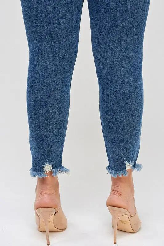 Elevate your style with our PLUS SIZE HIGH RISE DISTRESSED ANKLE SKINNY jeans. These jeans offer a flattering high rise fit and a trendy distressed look, perfect for any occasion. Comfort and style are combined for a confident and playful look. (Could we say "look" one more time?)