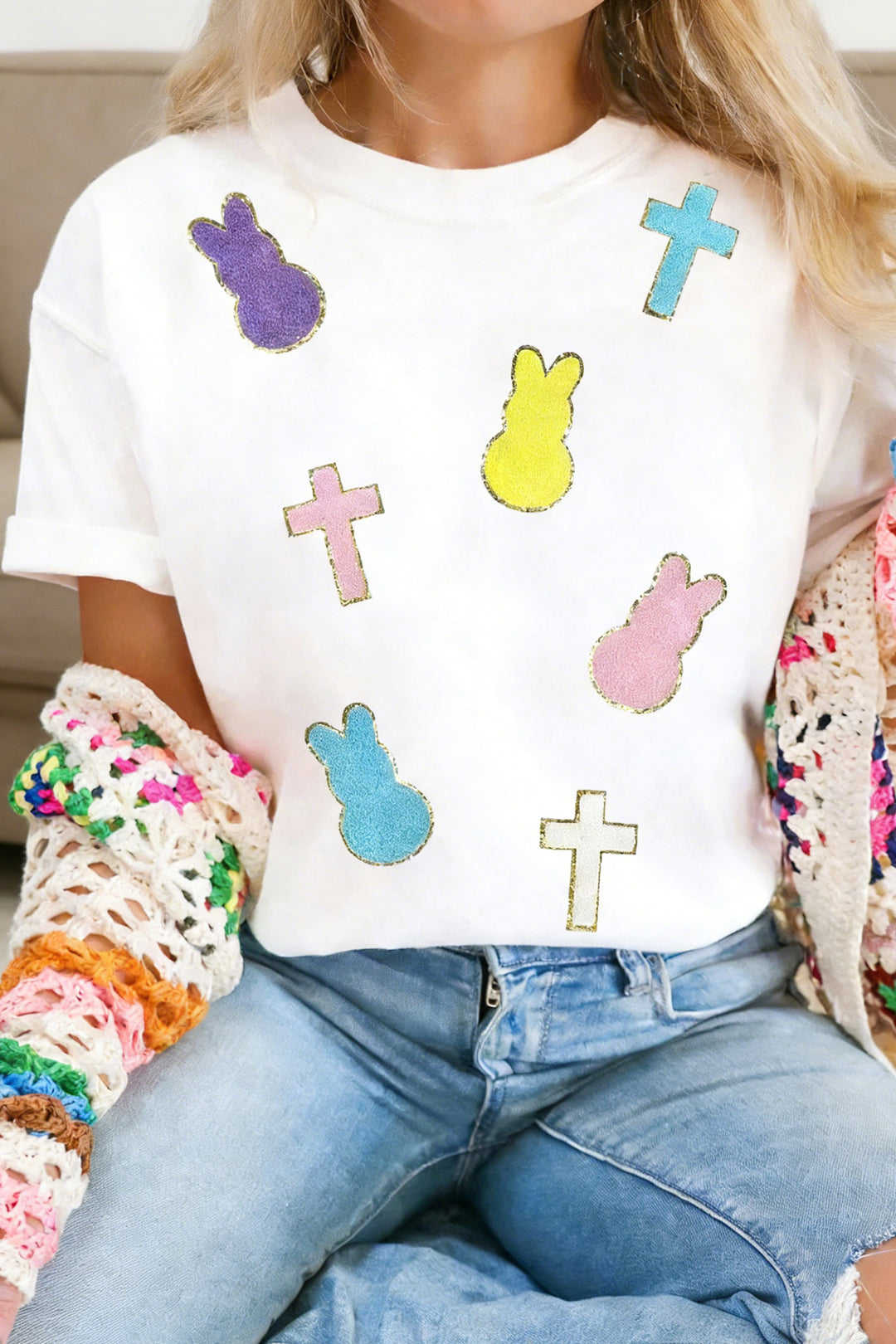 White Chenille Bunny Cross Patch Easter T Shirt
