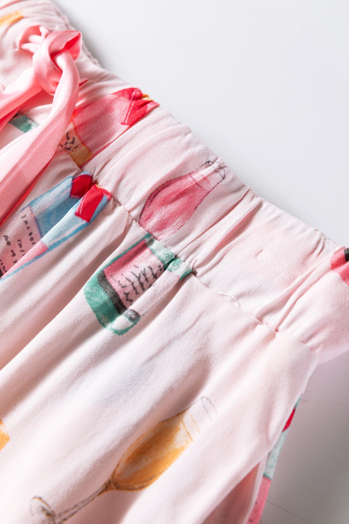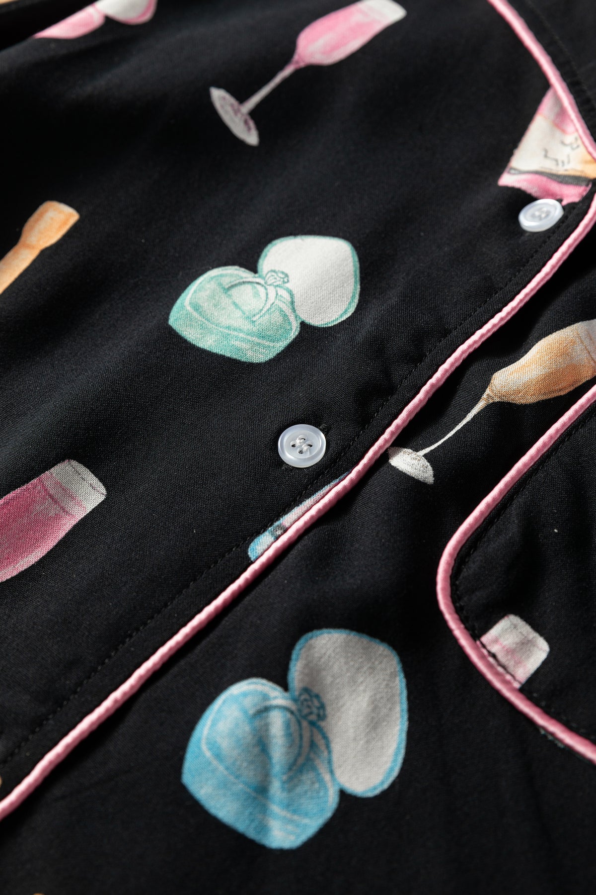 Slip into holiday comfort with this whimsical two-piece pajama set, featuring charming wine glass prints that celebrate the season in style. Adorable bow knot details add a playful, sweet touch to the classic black design, making it perfect for cozy nights in. The coordinating top and shorts create a complete, put-together look that's both festive and fun. Ideal for holiday relaxation or as a thoughtful gift for anyone who loves a little festive flair with their sleepwear.