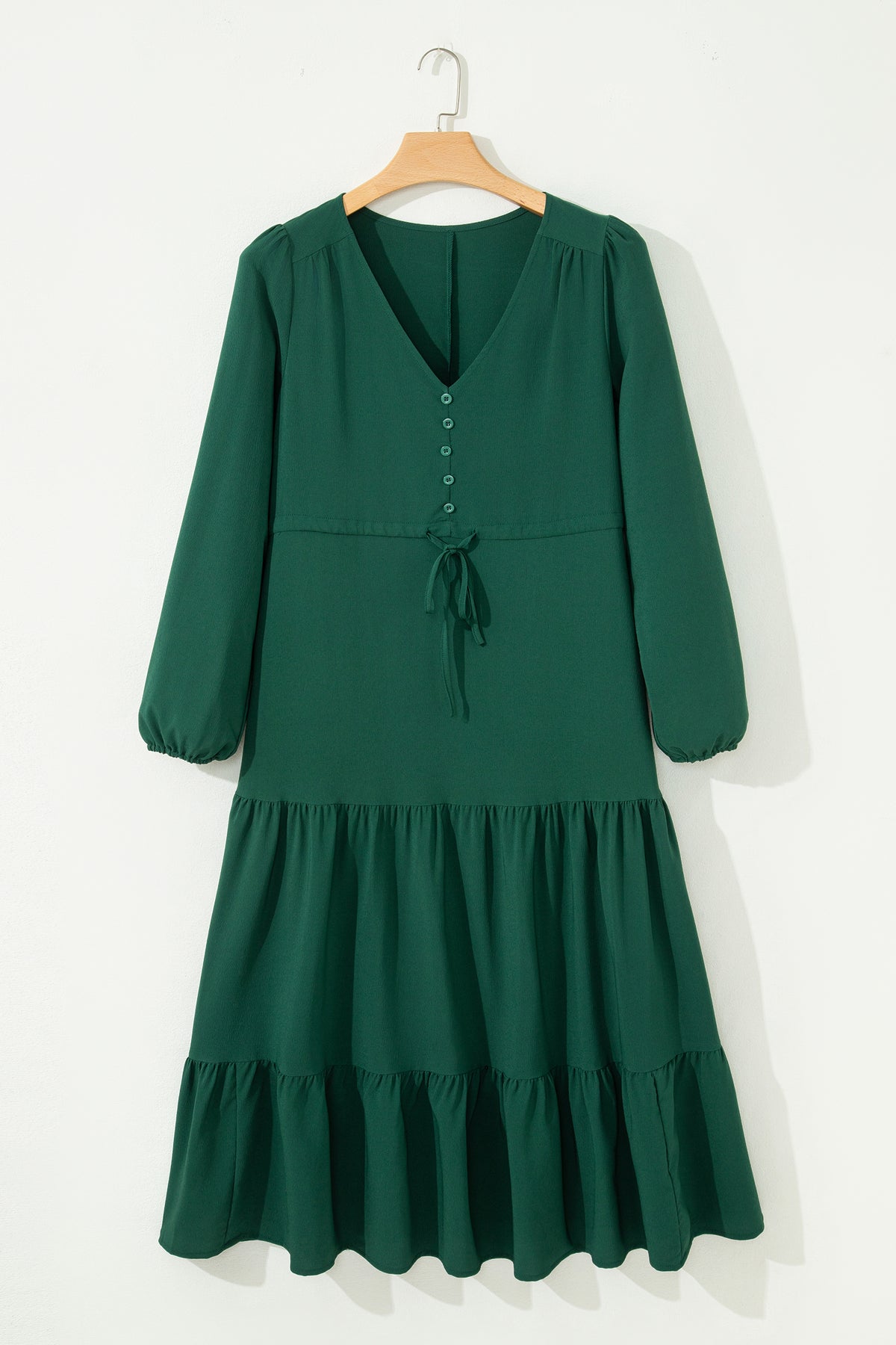 Meet your new go-to dress! This Blackish Green Maxi features a chic V-neckline and cascading tiered layers that flatter every figure. The front button detail adds a playful touch of personality, while the adjustable drawstring high waist lets you customize the fit to perfection. In a versatile solid hue, it transitions seamlessly from casual brunches to evening events—dress it up or down and always look effortlessly put-together.