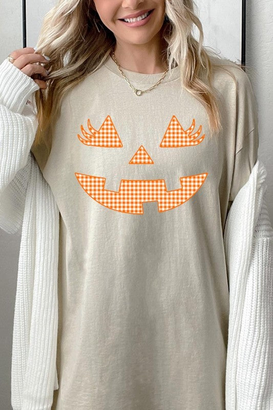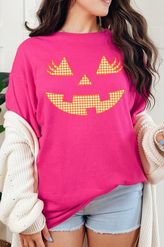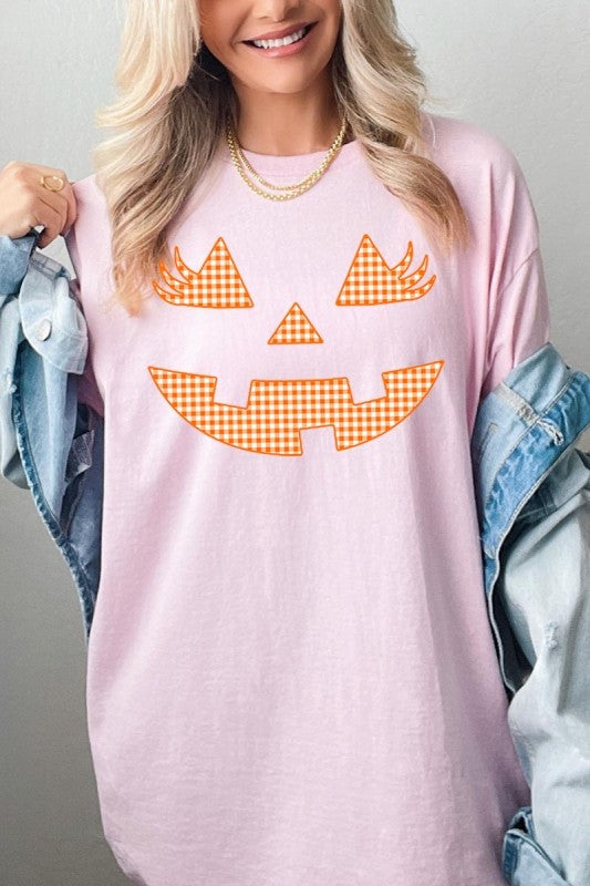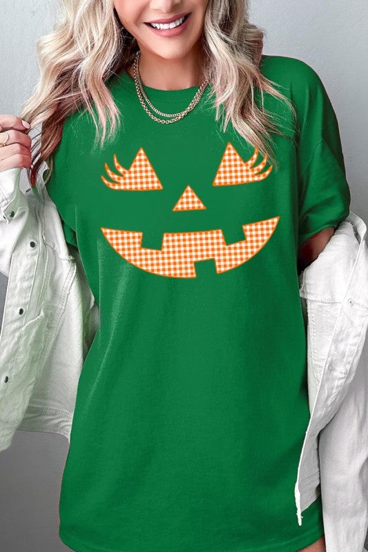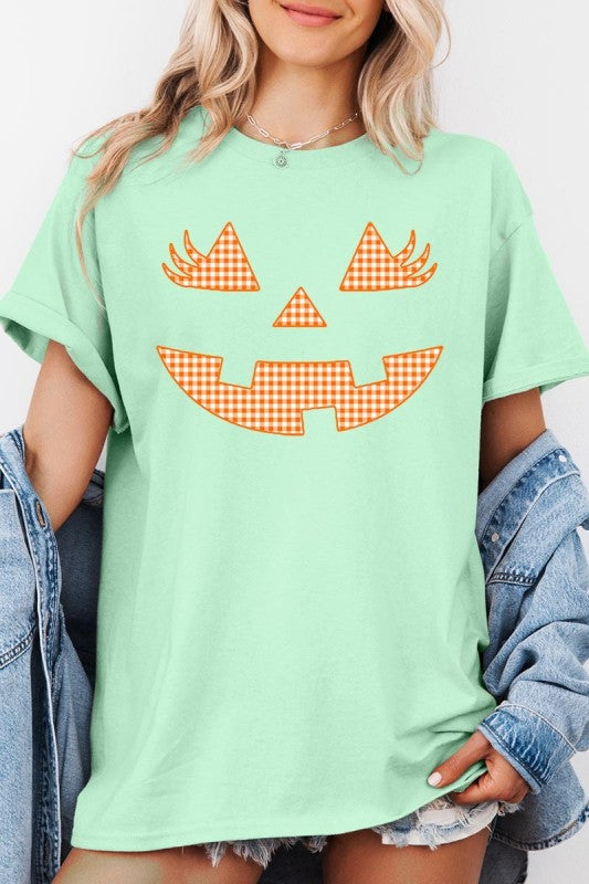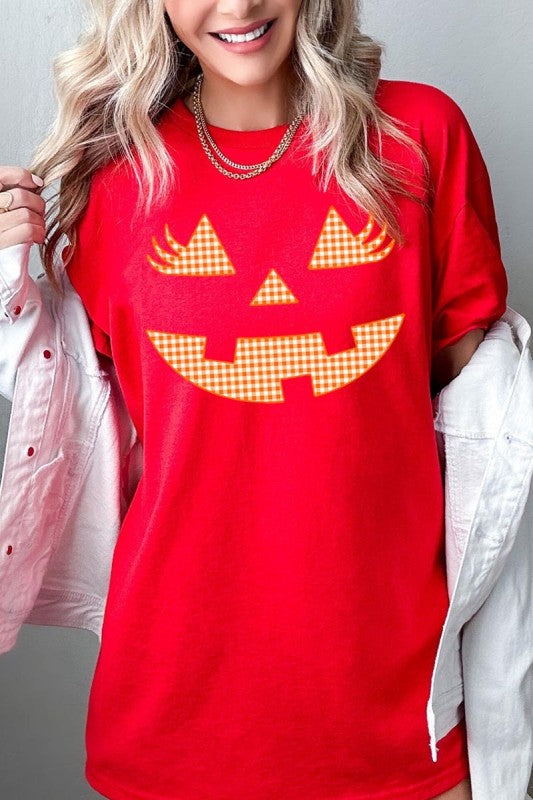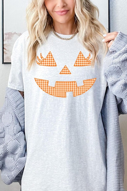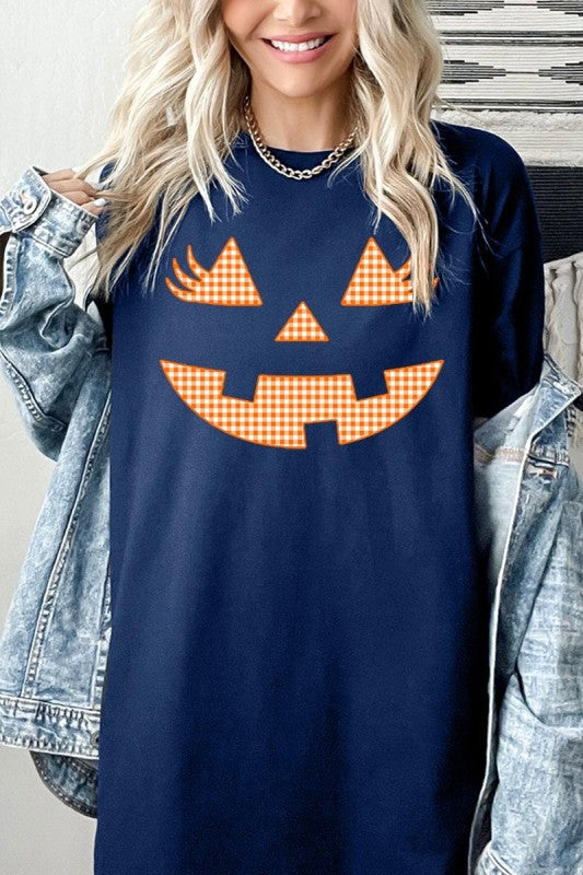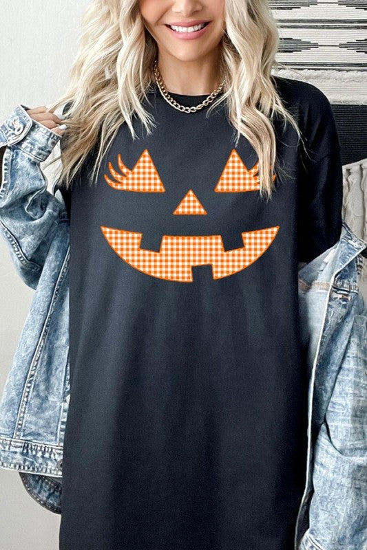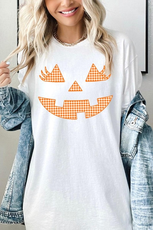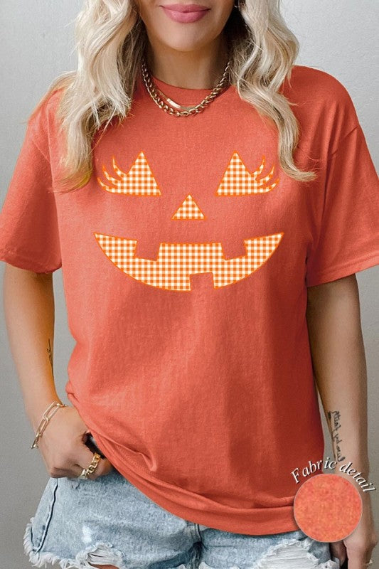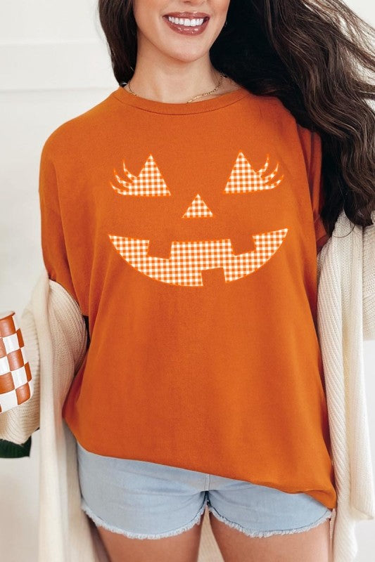 Halloween shirt, pumpkin face tee, jack o lantern top, gingham pumpkin shirt, fall graphic tee, cute halloween Graphic Heavy Cotton Tee.