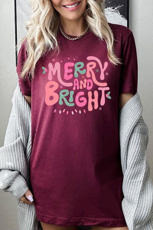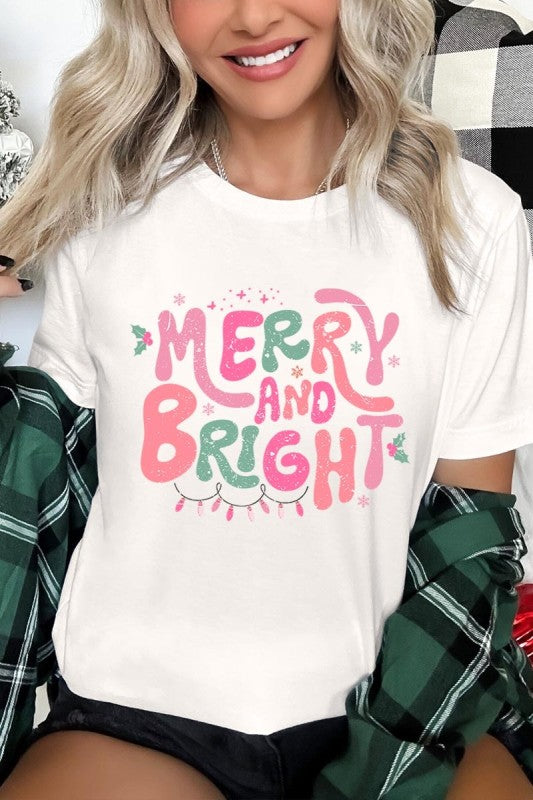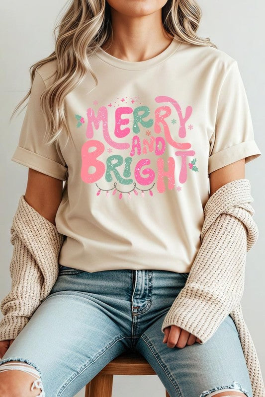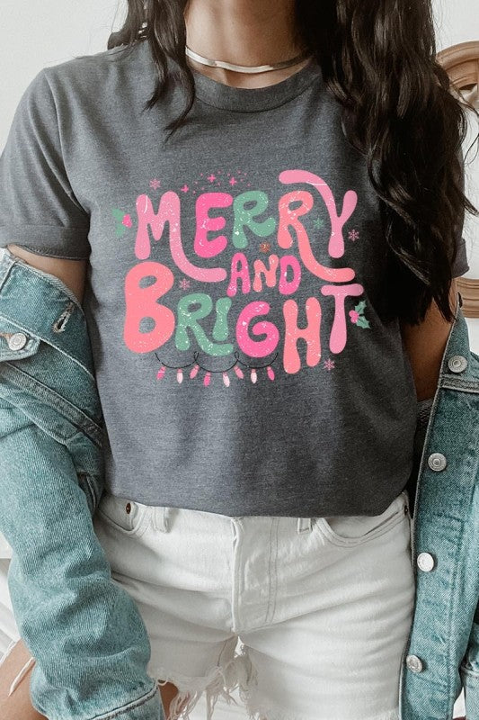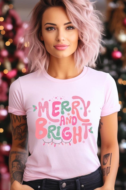 christmas lights tee, merry and bright shirt, pastel holiday top, festive graphic tee, colorful christmas outfit, cheerful holiday apparel, retro christmas t-shirt, boutique holiday fashion, fun festive look, cute christmas gift Graphic Tee.