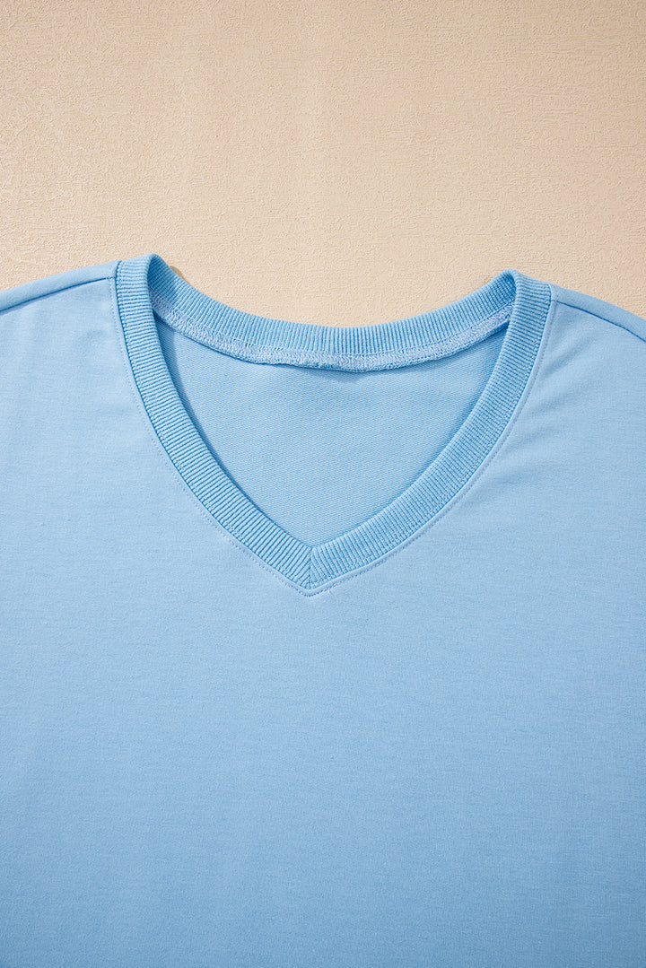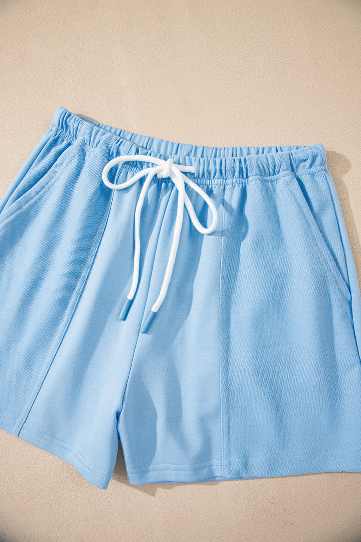 Stay effortlessly stylish in this solid shorts set, featuring a v neck tee with a chic drop shoulder design and appealing drawstring shorts with patchwork details. Perfect for any trendy fashionista!
