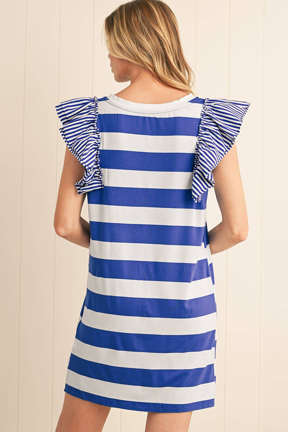 Back view of Sky Blue Stripe Ruffle Sleeve T Shirt Dress showcasing striped ruffle sleeves and relaxed fit, ideal for elegant summer style.