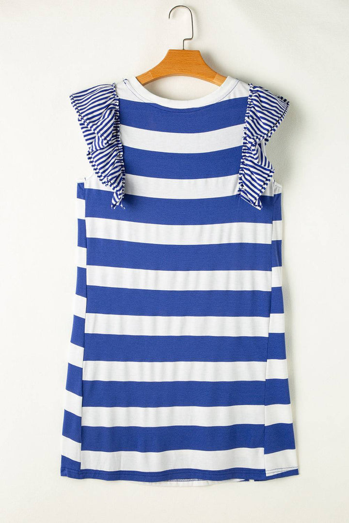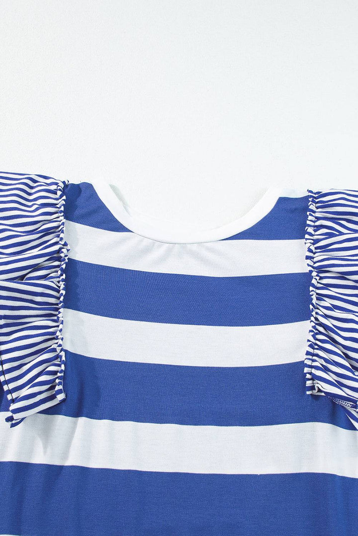 Sky Blue Stripe Ruffle Sleeve T Shirt Dress styled with relaxed fit and feminine ruffle details, great for warm weather fashion.