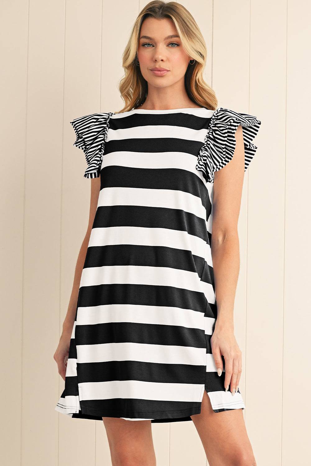 Black and White Stripe Ruffle Sleeve T Shirt Dress modeled for a bold and stylish summer outfit, available at Faith & Co. Boutique.