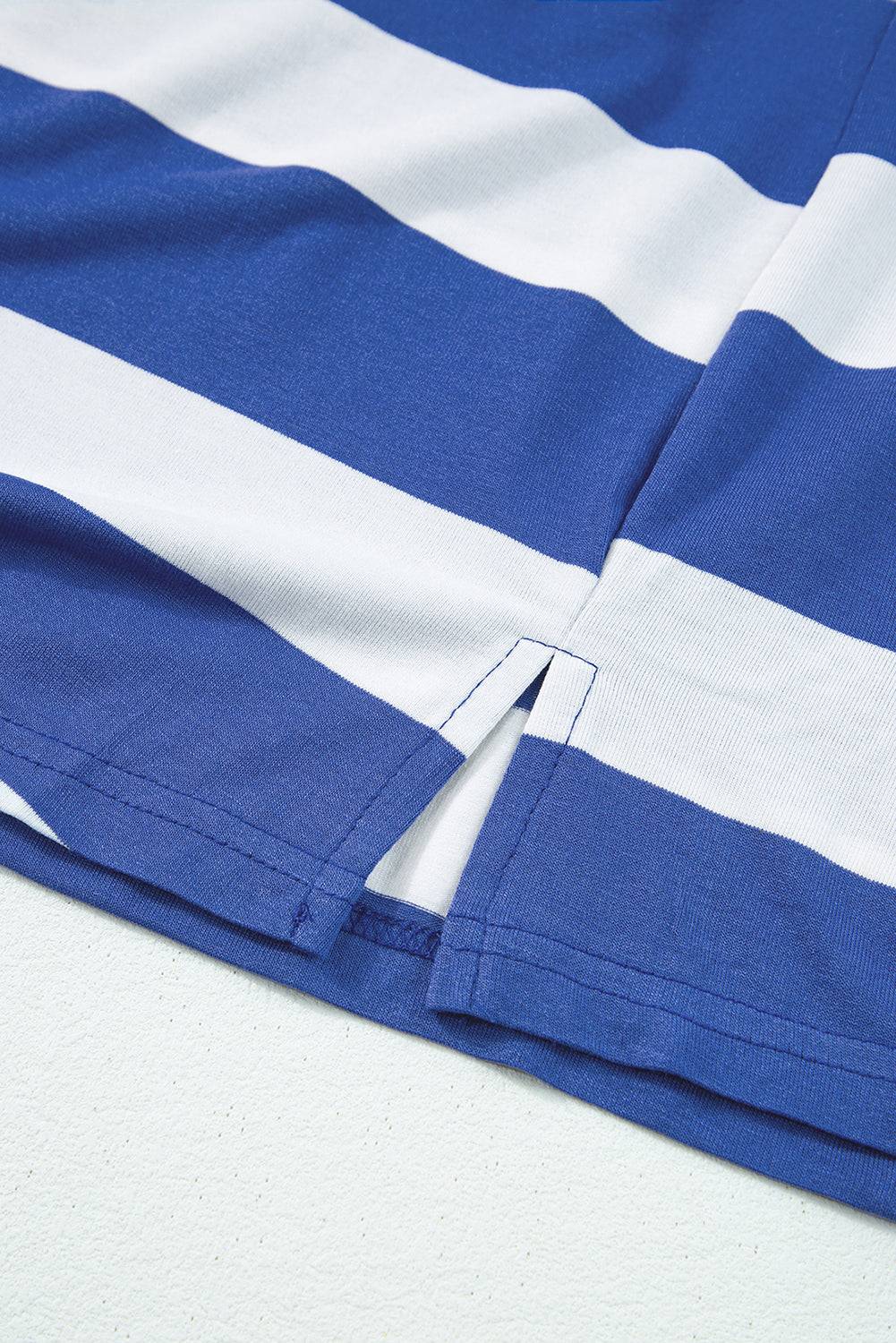 Close-up of side slit hem on Sky Blue Stripe Ruffle Sleeve T Shirt Dress, designed for comfort and casual elegance.
