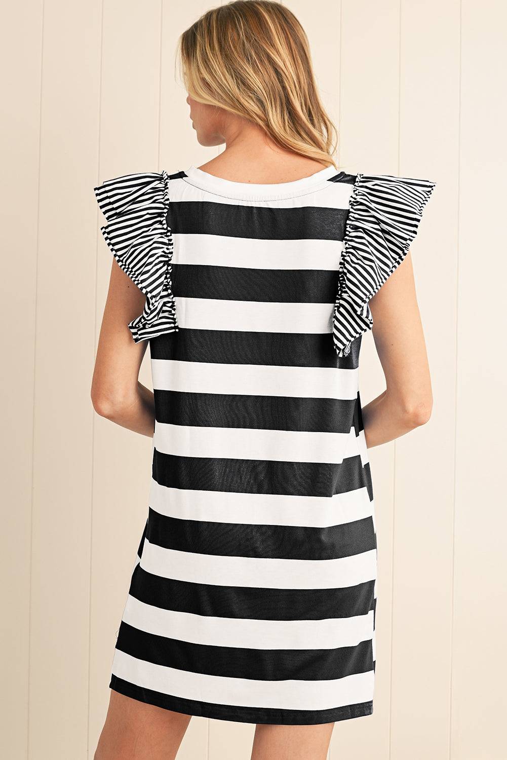Back view of Black and White Stripe Ruffle Sleeve T Shirt Dress showing ruffle sleeve detail and relaxed fit.
