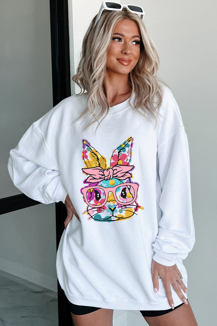 Get ready for Easter with this White Floral Rabbit with Glasses Graphic Corded Sweatshirt! Made with soft corded fabric for all-day comfort, this sweatshirt features a cute rabbit wearing glasses and adorned with floral elements. Its crew neck design and long sleeves offer a classic and relaxed fit. Add a touch of festive fun to your everyday outfit with this sweatshirt.