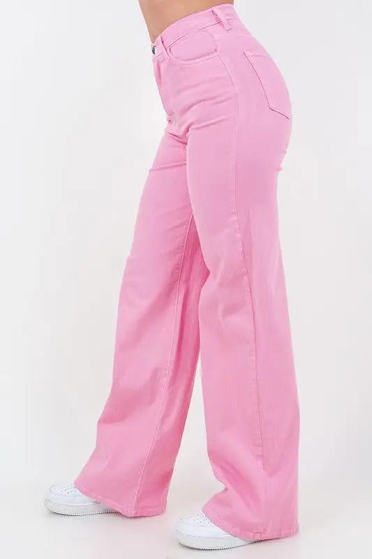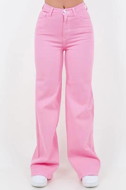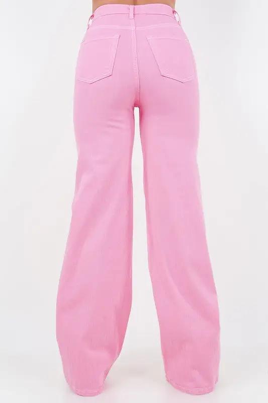 Introducing our playfully chic Wide Leg Jean! These jeans feature front and back pockets for functionality, a front button and zipper closure for convenience, and a premium soft stretch fabric for maximum comfort. With a fun bubblegum pink color, these jeans are directly garment dyed and constructed and treated right here in the USA. Inseam length is 33\". (Fashion-forward and USA-made!)